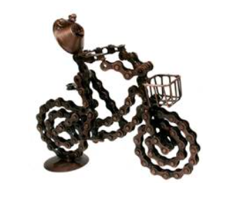 A bronze coloured cyclist on bike with basket made completely from recycled bike chains.