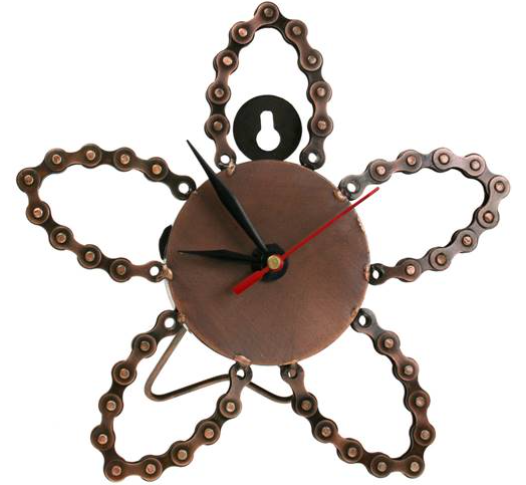 A beautiful bronze coloured clock made with recycled bike chains in the shape of a flower. Can be freestanding or hung on wall.
