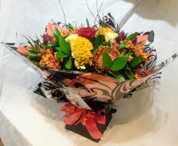 A beautiful hand tied bouquet of seasonal flowers chosen by the florist, gift wrapped and standing in its own box and water bubble. [Flower varieties may vary from photo].