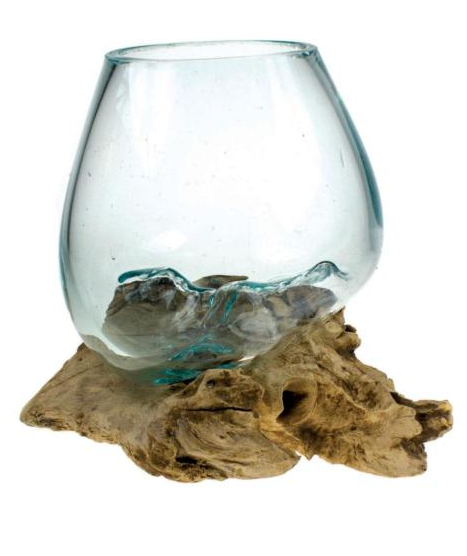 These beautiful recycled glass bowls are molded to fit a naturally shaped wooden base, making each one unique. They look nice in their own right but are also ideal for single flowers, or floating candles.