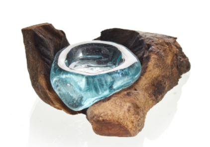 A recycled glass t lite holder made to fit its natural wood base whilst still molten.