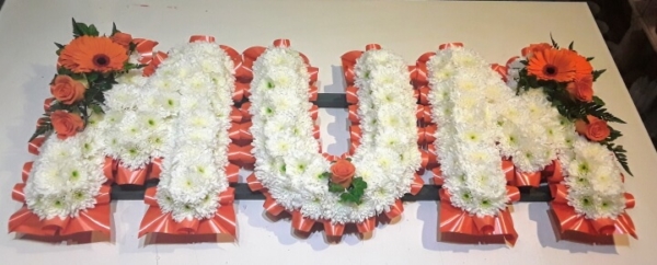 A special MUM tribute on a white massed base with flower clusters in your choice of colour.