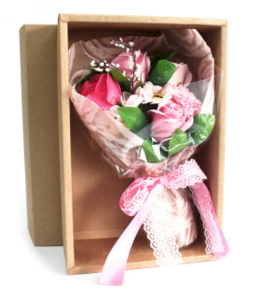 Soap flowers in a bouquet in pinks. Each flower can be put in the bath for luxurious scented water.