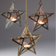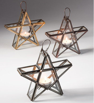 Metal and glass lanterns deigned to hold t lites. These are free standing but can be hung up as well.