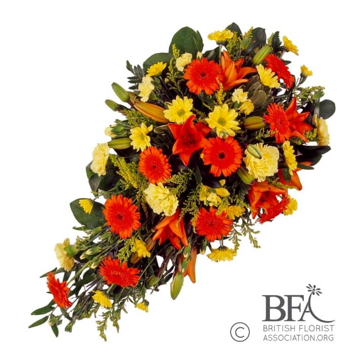 A single-ended Spray in the shape of a Teardrop in mixed seasonal flowers. Choose up to 3 colours.