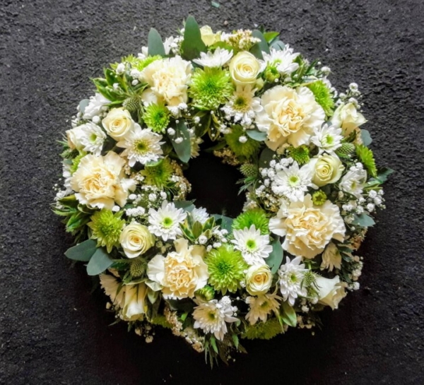 A mixed selection of seasonal flowers arranged in a wreath.